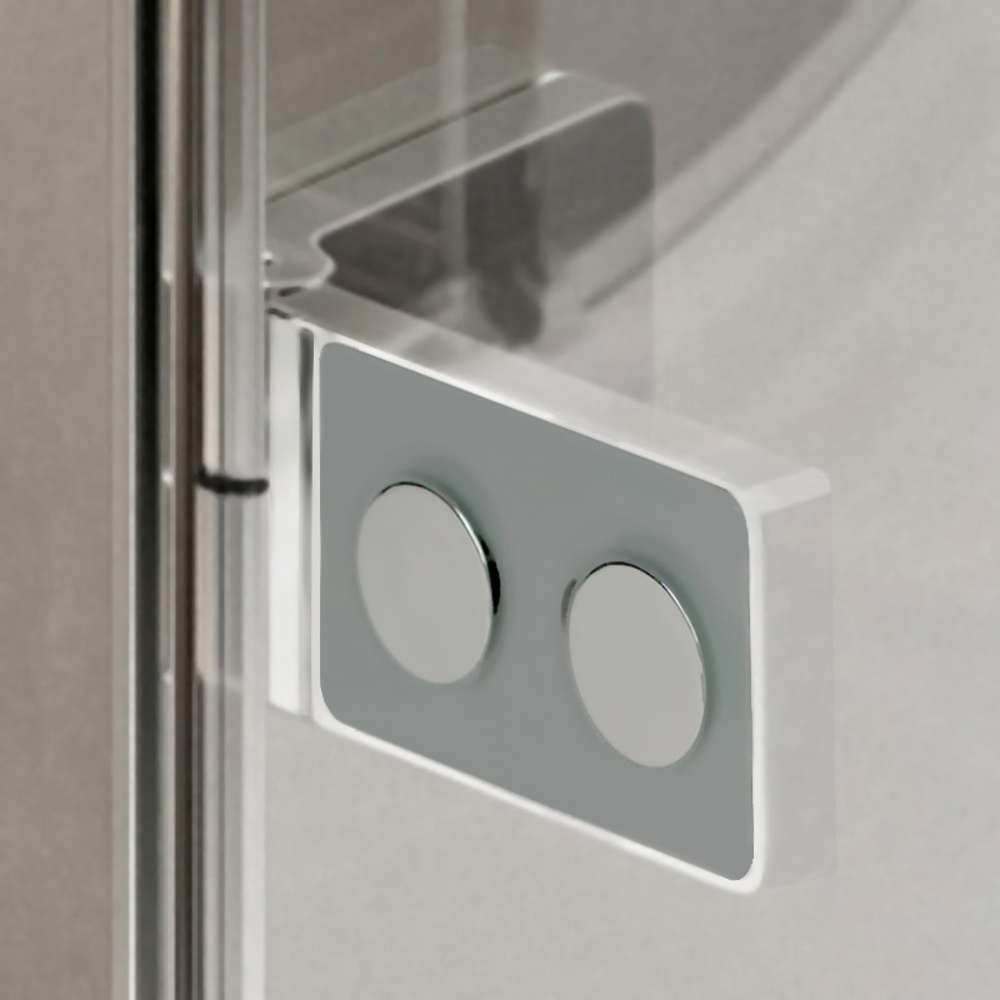 - Inovativní panty: Zapuštěné dovnitř skla umožňují hladké stírání bez větších překážek. Zdvihací systém s aretací v krajních polohách a v poloze 90° zase zajišťuje tiché otevírání bez tření o podlahu – žádné drhnutí ani stopy od vody. Každý pant drží na čtyřech šroubech, což eliminuje “sedání” dveří a zajišťuje stabilitu